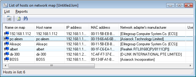 as a map, but also as a list. To build the list of the current map's objects, select the Service | Map object list item in the main menu. The list displays the map object names and network addresses, their IP and MAC addresses, NIC manufacturers, and other data.
