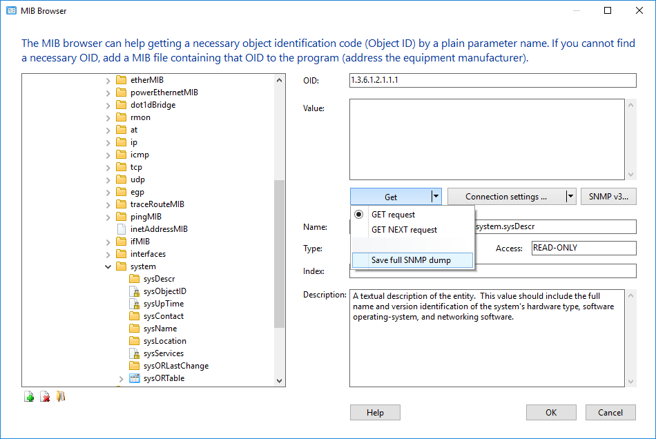 In addition to just watching the MIB tree, you can get values of its SNMP variables. To do this, click the Connection settings... button and specify the community string or login/password (for SNMPv3).