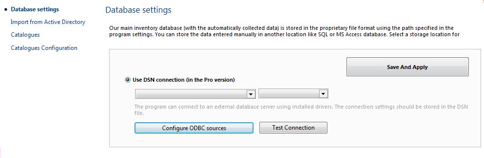 In the Pro version of the program, there is an opportunity to store the collected data in network databases (MS SQL, MySQL, PostgreSQL, Firebird). To configure the network SQL database storage, go to the tab "Data" - "Catalogues" - "Database settings", select "Use DSN connection", and press "Configure ODBC sources". A dialog will appear on the screen in which you need to specify the DSN source.