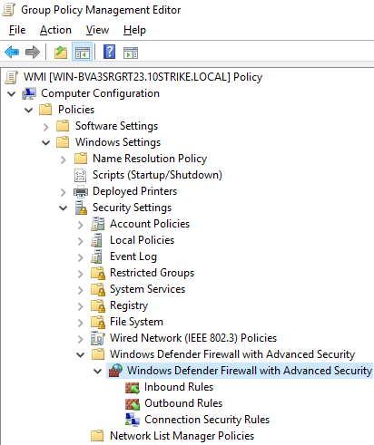 - Navigate to Computer Configuration - Windows Settings - Security Settings - Windows Defender Firewall with Advanced Security - Windows Defender Firewall with Advanced Security